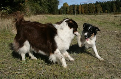 Jatsi pääsi eilen pitkästä aikaa hierojan käsittelyyn. Selkä oli jälleen jumissa, mutta jalat onneksi ei. On se uskottava, että kun Hipan kanssa leikkiminen loppuu niin silloin on isosisko kipeä. Aloin jo vakavasti harkita koirahierojakoulutukeen menoa ja into vain lisääntyi, kun kuulin Hannen pyrkivän samaan paikkaan. Hyvä kun ehdin ääneen ajatella asiaa, niin muutamat olivat jo suunnilleen varaamassa aikoja koirilleen. Kiva tietää, että asiakkaita on odottamassa. Senja ja Jyry tulivat Espoosta näille nurkille syyslomaa viettämään ja toivat Lion meille hoitoon ainakin yhdeksi yöksi. Outoa kun talossa on uros, joka on kuitenkin niin rauhallinen, ettei ymmärrä ollenkaan näitä minun vilkkaita tyttöjäni. Illan se vietti eteisessä sen oloisena, että voisi lähteä kotiin vaikka heti eikä ruoka maistunut. Annoin olla rauhassa ja käskin omianikin jättämään Lion rauhaan. Kerran se kävi yöllä kysymässä minulta, että joko nyt viet minut kotiin. Aamulla se oli ihan entisensä eikä vierastanut näitä...